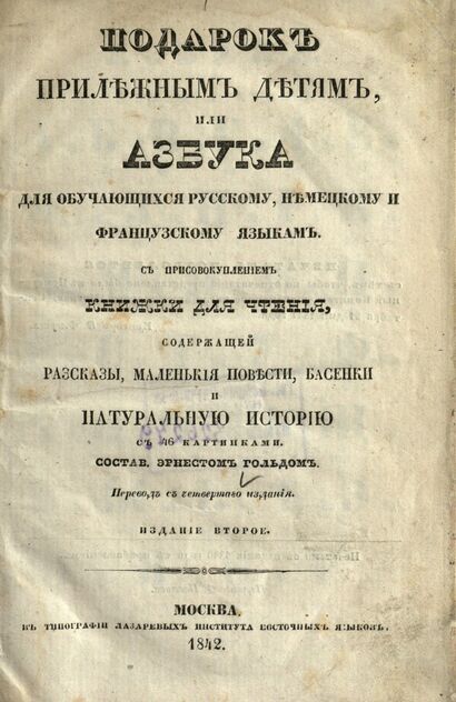 Подарок прилежным детям, или Азбука для обучающихся русскому, немецкому и французскому языкам. С присовокуплением книжки для чтения, содержащей рассказы, маленькие повести, басенки и натуральную историю с 46 картитнками
