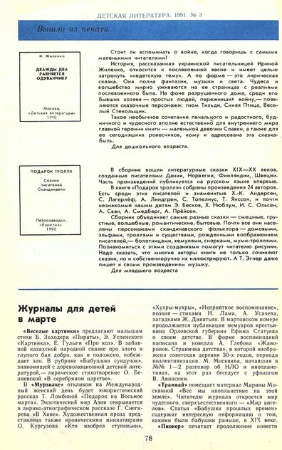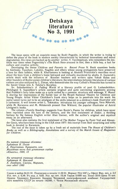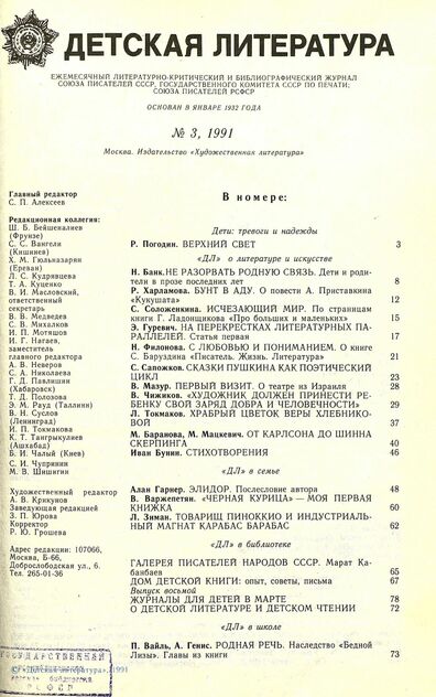 Детская литература. 1991. № 3: ежемесячный литературно-критический и библиографический журнал Союза писателей СССР; Государственного комитета СССР по печати; Союза писателей РСФСР