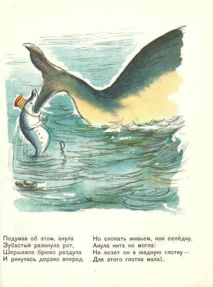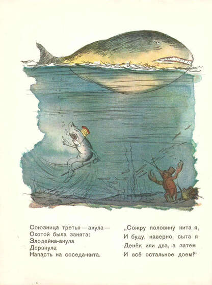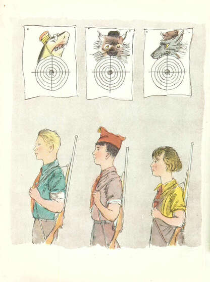 Кончалась эта книжка смелыми я мужественными лицами ребят с винтовками (мы еще вернемся к этому сплаву сатиры и патетики): «Возьмите винтовки, ребята, и дружно затворами: щелк! Не слопают нашего брата акула, гиена и волк».