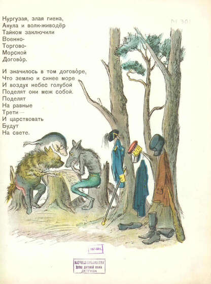 «Акула, гиена и волк» открывалась изображением акулы в самурайской фуражке, гиены с выпяченной муссолиниевской челюстью и волка в полном гитлеровском обличье. Текст гласил: «Кургузая злая гиена, акула и волк-живодер тайком заключили военно-торгово-морской договор». Дальше шли рисунки и стихи, каждый штрих, каждая строчка которых подчеркивали мысль: «Пускай создают договоры делят разбойники власть. Не могут убийцы и воры у мира свободу украсть».