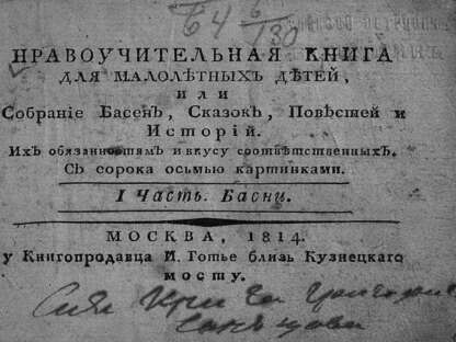 Нравоучительная книга для малолетних детей, или Собрание басен, сказок, повестей и историй, их обязанностям и вкусу соответственных: С сорока осьмью кртинками: I часть: Басни: [Альбом]