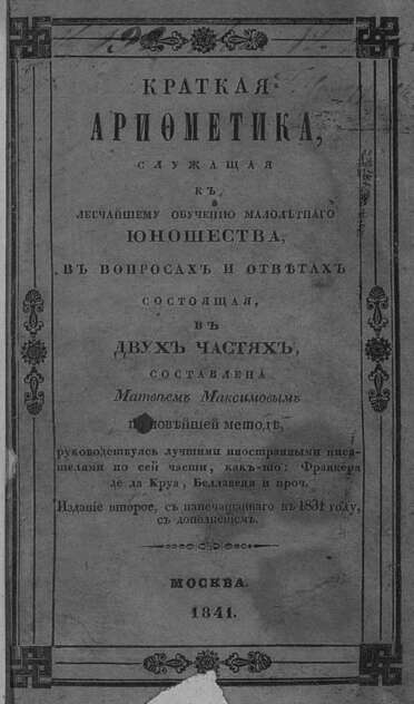 Краткая арифметика, служащая к легчайшему обучению малолетнего юношества, в вопросах и ответах состоящая, в двух частях