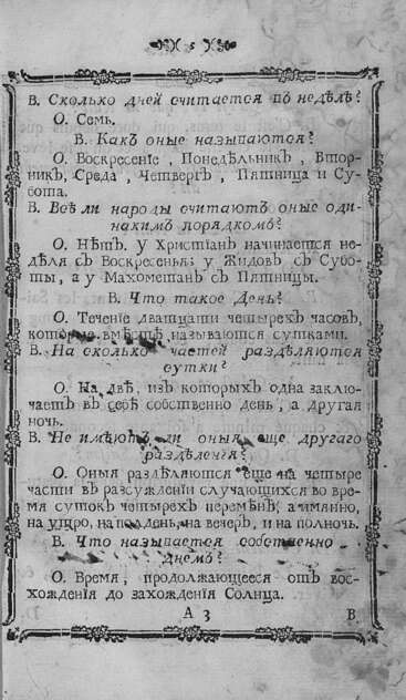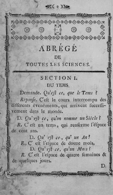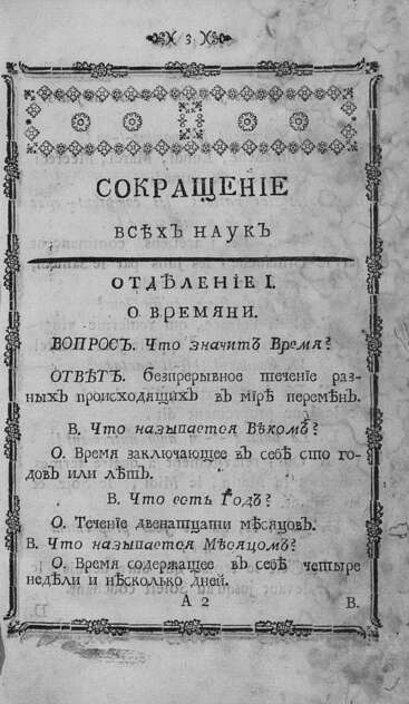 Оригинал хранится в ГПИБ; Загл. и текст парал. на франц. и рус. языках; Значительно перераб. пер. соч. J.H.S.Formey "Abrege de six ans jusqu'a douze". Из 21 отделения переведены только 12, причем значительно пополнены материалом о России; Др. пер. книги вышел под загл.: "Краткое понятие о всех науках, для употребления юношества" и "Краткое понятие о всех науках, для употребления юношества и женщин"