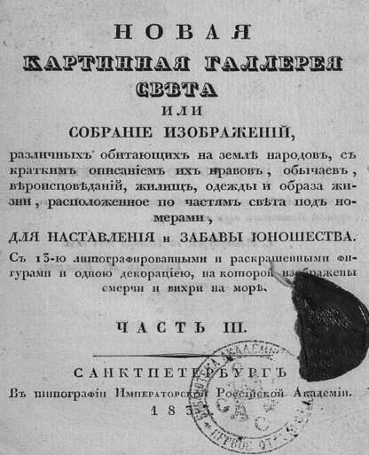 Новая картинная галлерея света, или Собрание изображений, различных обитающих на земле народов, с кратким описанием их нравов, обычаев, вероисповеданий, жилищ, одежды и образа жизни, расположенное по частям света под номерами. Ч. III: для наставления и забавы юношества: с 13-ю литографированными и раскрашенными фигурами и одною декорациею, на которой изображены смерчи и вихри на море.